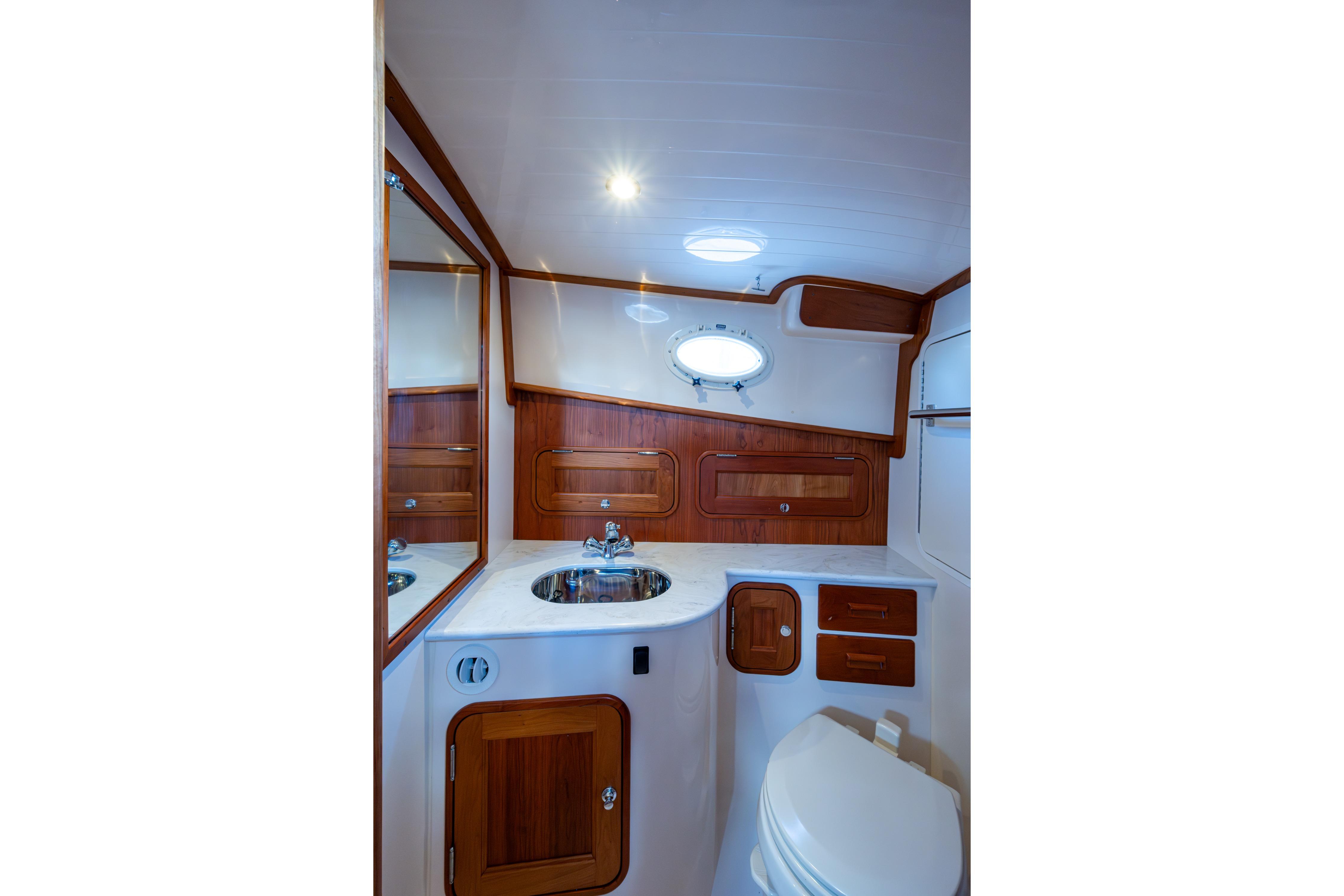 Entry to the air-conditioned cabin below is through the pilothouse companionway and down two steps. The galley is to port, private head to starboard, and the V-berth accommodations forward. The interior is finished in satin-varnished cherry. Cabin sole is varnished teak and tulipwood. Flat panel cherry locker doors and multiple stainless steel bulkhead lights add to the cabin ambience. An opening hatch and three fixed and one opening port light add natural light and visibility, and ventilation when desired.