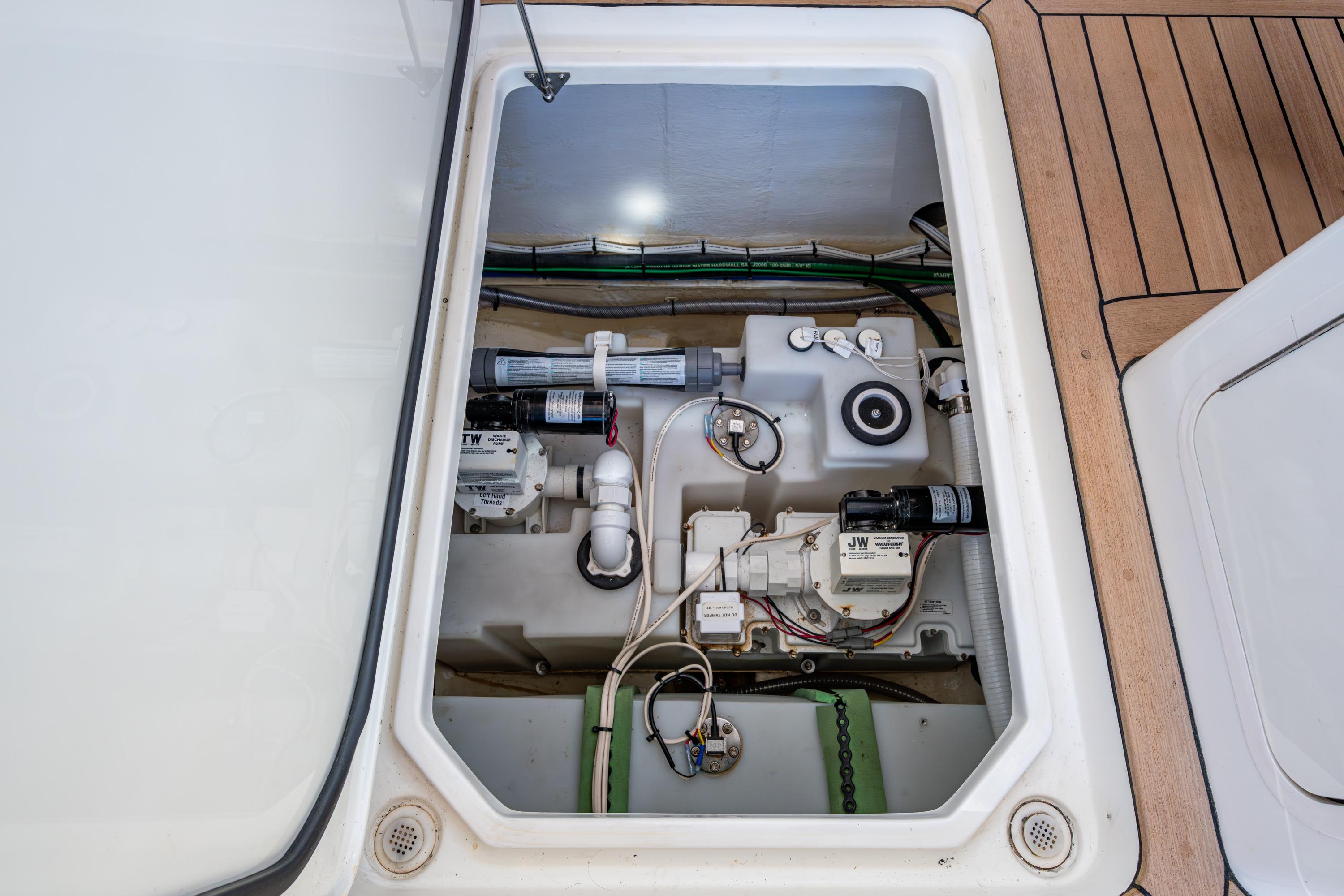- VacuFlush electric marine head plumbed to a custom 28-gallon polyethylene integrated holding tank with deck pump out fitting